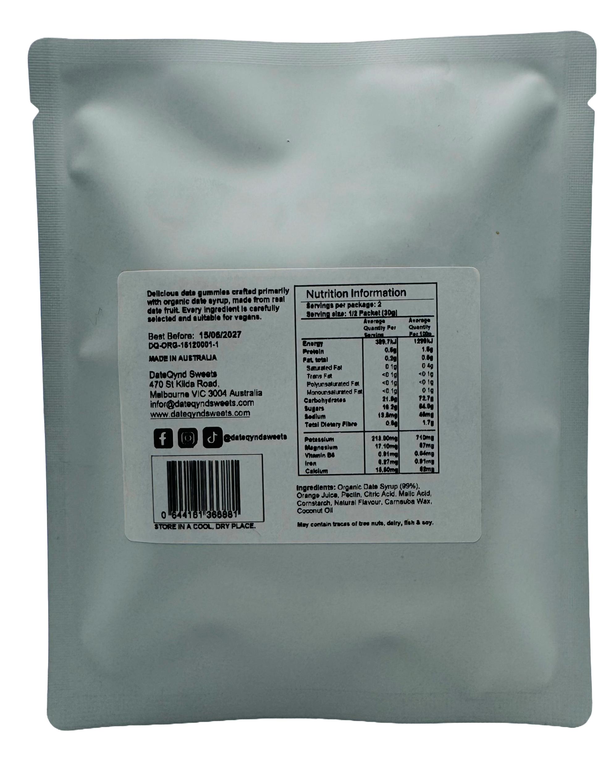 Our Orange Flavour DateQynd Sweets gummies come in a box of 10 convenient 60g packets, made with thoughtfully selected, plant-based ingredients, with no artificial flavours, colours or sweeteners. It's just the goodness of organic date syrup with a clean burst of orange bliss enjoyed in the form of DateQynd Sweets gummies!